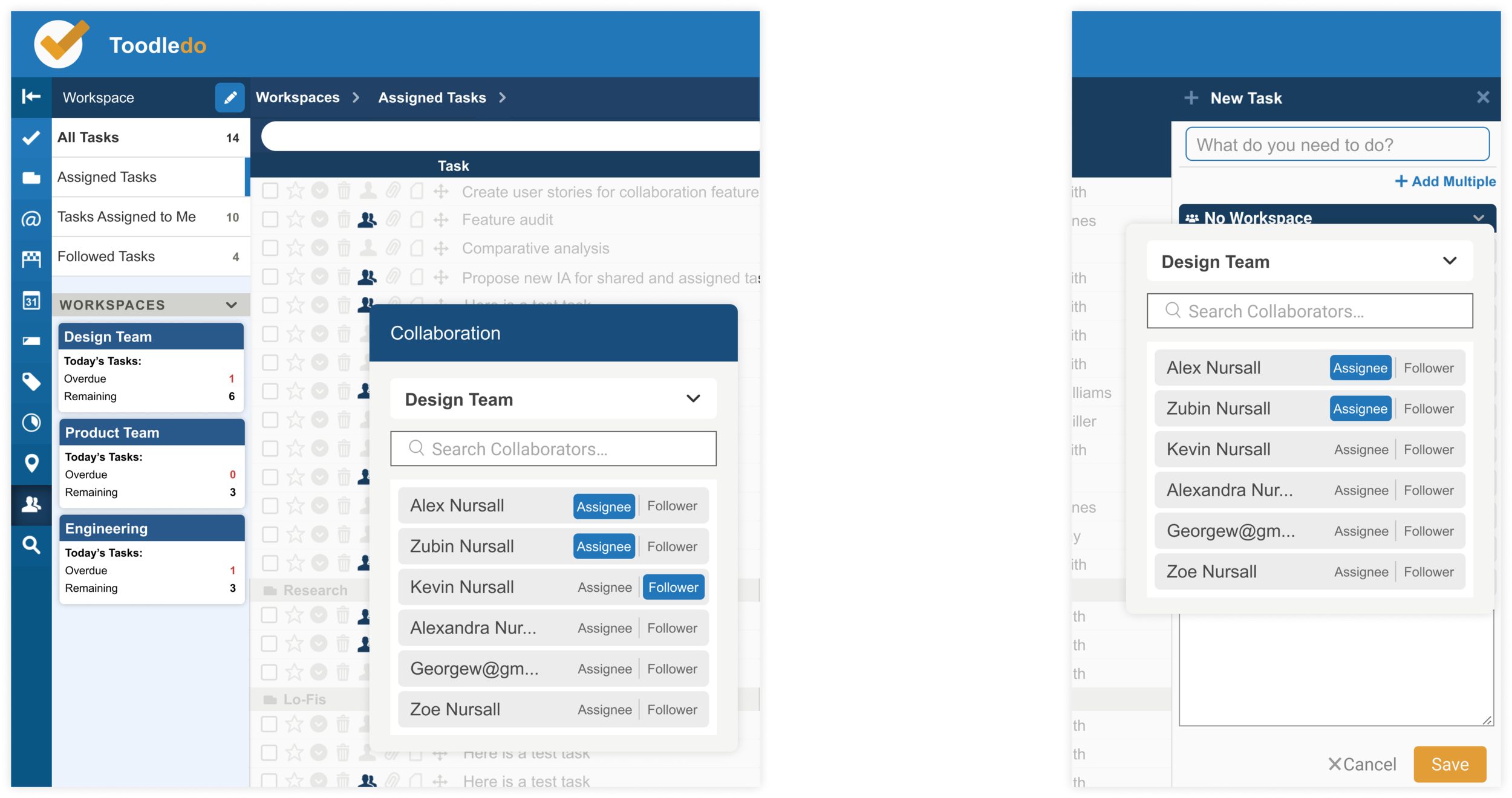 User testing revealed that new users wanted to be able to add collaborators as they were creating the task. They were often confused by the fact that they could not do this. Prior to the redesign, they would (1) create the task, (2) wait for it to appear on their task list, and then (3) click into it and (4) change the assignment manually. The redesign allowed them to add collaborators instantly.